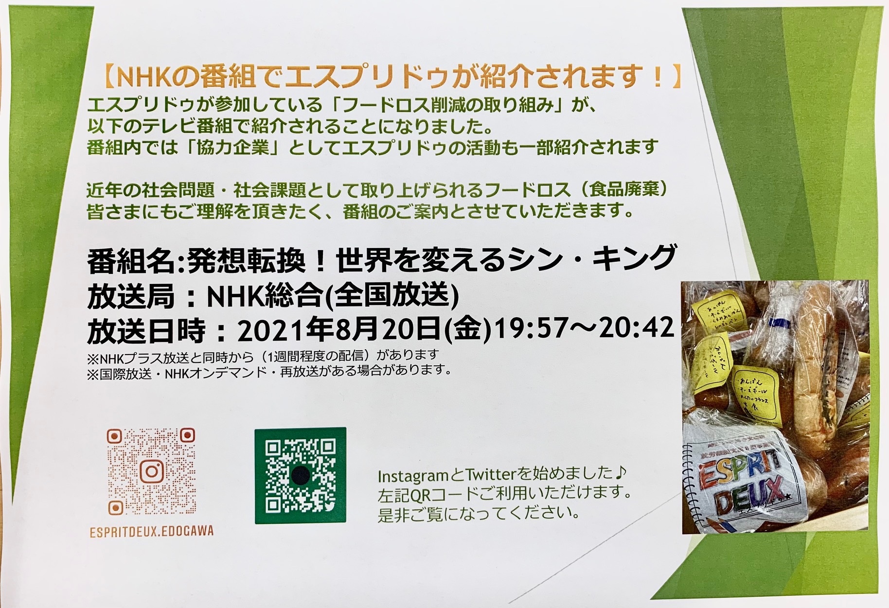 番組内では「協力店舗」としてエスプリドゥの活動も一部取り上げられますされます。